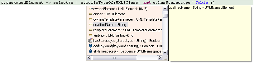 - The “+” operator can now be used whenever one of the operands is a String for concatenation, in order to avoid the verbose concat(String) OCL offers.
