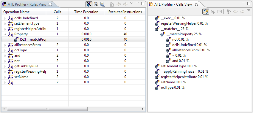 The profiler contribution has finally been integrated. It provides a profiler available for both VMs, usable through the launch configuration “Advanced” tab, in the VM selection. The profiling of an ATL transformation is very helpful to find the performance issues inside of a transformation, by displaying various informations about the execution in the dedicated views.