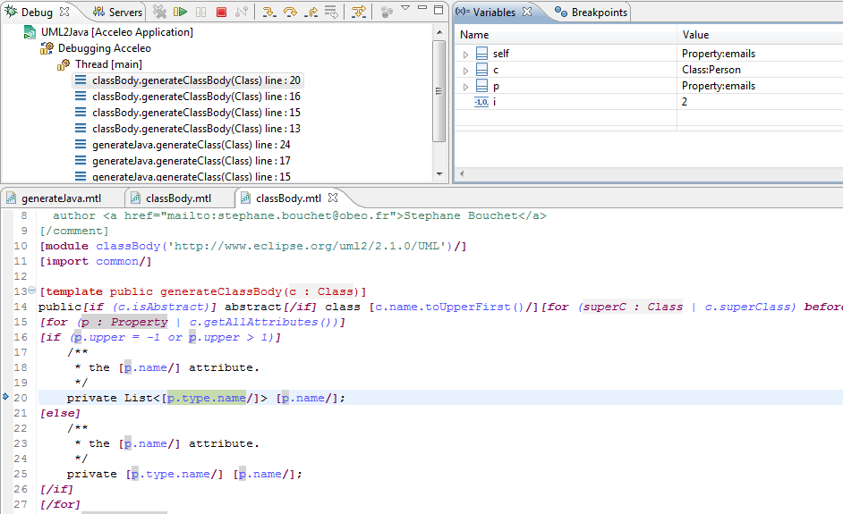 - The Acceleo debugger now provides you with the list of available variables at a given point in the evaluation process, along with the values of these variables for a given stack frame. Moreover, the displayed stack frames now represent Acceleo module element corresponding to your current expression stack. As for the previous release, debugging templates only requires you to set breakpoints in the Acceleo modules as you would usually with Eclipse : open an editor, double click in the left margin on the line you wish the breakpoint to be set, and launch the generation through the menu Debug As => Launch Acceleo Application.