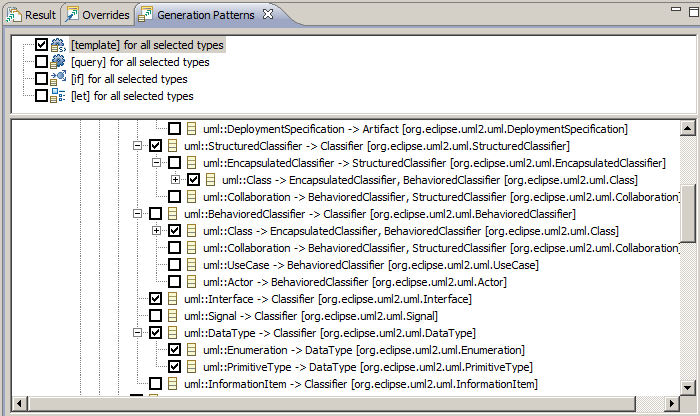 - Last but not least, the Generation Patterns view has been introduced to help you implement behavior for an interface/class and all (or a subset of) its subtypes. For example, let’s say you wish to implement a template named javaName which will generate the name of any classifier. This template will need some default behavior for interfaces and specific behavior for some classifiers. Open the Generation Patterns view, tick [template] for all selected types in its top part, and all of the types you wish to generate a template for in its bottom part. Once done, the content assist in the Acceleo editor will give you the choice [template] for all selected types which yo just have to choose in order to generate all of the templates you asked for. Now that you no longer risk forgetting one or more subtypes, it is left to your discretion to implement the behavior for each of them.