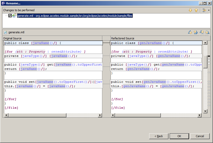 - It is recommended to use a bottom-up approach when developing generators ; Acceleo now eases this process by allowing you to initialize the content of a generation module with an example, and offering specific actions to transform these examples (static text) in dynamic OCL expressions. For example, changing all occurrences of MyClass to [c.name.toUpperFirst()/] in a single click.