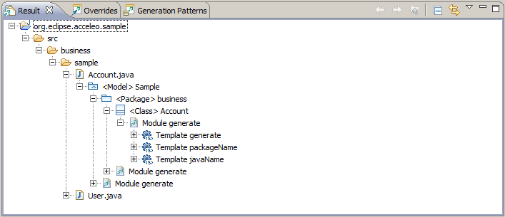 - First of all, the Result view allows you to get feedback on the traceability information we could retrieve during the evaluation of your modules. As long as this view has been opened, Acceleo will record every bit of information it can to synchronize your generated text with the generation module and source model. Ever wondered why such or such portion of text has been generated one way or another? What part of your generation module has generated the name of such or such method? From which element of your model has been generated such or such import? This is the view you can use to retrieve these pieces of information.