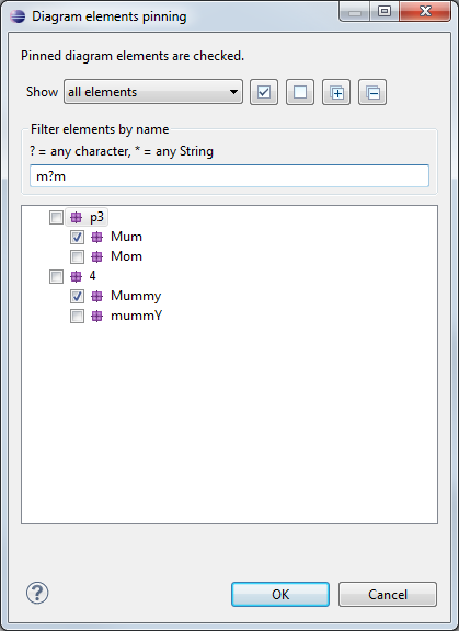 This open a dialog that display the diagram elements as a tree. This way the user can choose the elements to pin or unpin more easily.