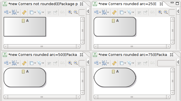 For diagram elements which have rounded corners (as specified in their style element in the VSM), the arcWidth and arcHeight attributes indicate the size of the rounding. In Viewpoint 4.6.x, that size was incremented in big steps each time the attributes were incremented, as seen in the screenshot below (respectively with no rounding, and rounding with arc sizes of 1, 2 and 3):