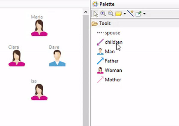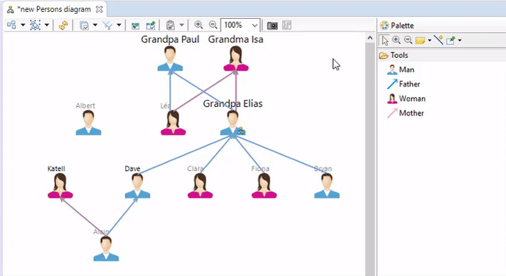 This tool, available in the top of the palette, automatically proposes a set of possible relations. Based on the edge creation tools that you have defined, this new tool selects the ones that are compliant with the source and target objects selected by the end-user.