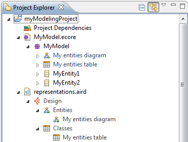 The representations contained in the Modeling project are accessible from the Project Explorer (under the .aird file or under the semantic model file).