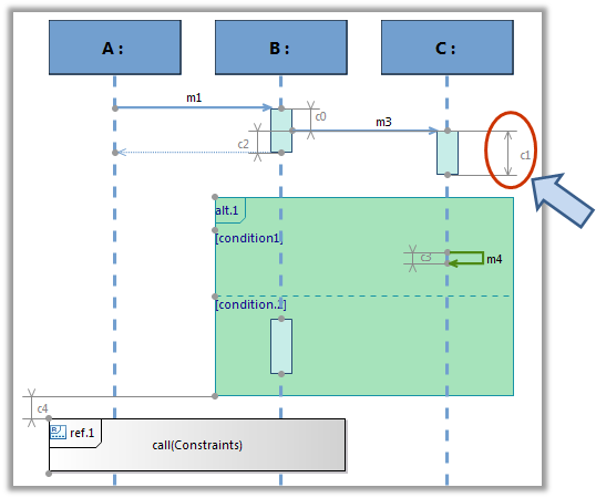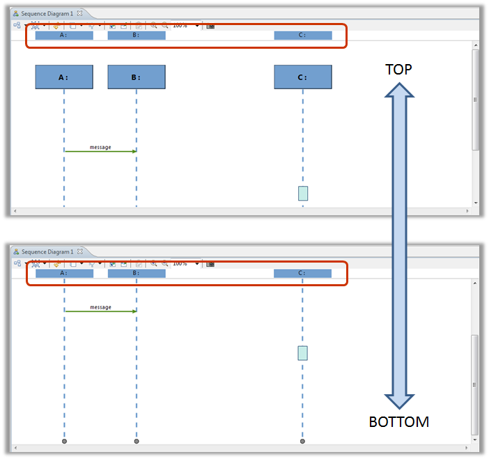This header contains the objects corresponding to each lifeline. It is always visible, even when you scroll to the bottom of the sequence diagram.